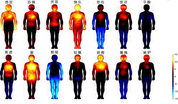 因为,情绪是一种能量。它不仅仅是一个念头,一种想法。每种情绪的来临都会让我们的身体形成相应的能量场。在下图中我们可以清晰的看到各种不同情绪时,人体的状况。比如第一排第一个情绪是愤怒,人在愤怒的时候,胸部以上、上肢看起来十分热,有成语形容,“怒发冲冠”、“怒火中烧”。第二排第三个情绪是绝望,整个人体中间发黑,其余部分呈现蓝色,给人感觉很冷。这也是为什么我们遇到某些人会觉得如沐春风,遇到有些人却会觉得很丧气。